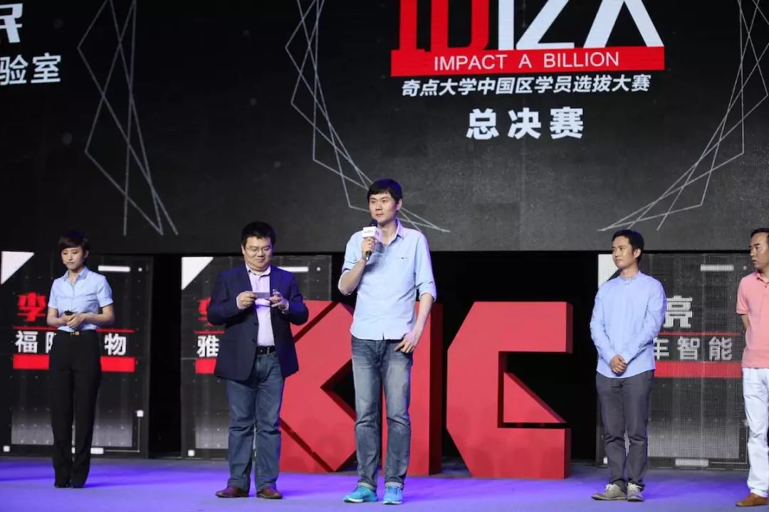 这是奇点大学的校徽和校训——为加速科技变化而准备人性