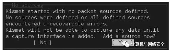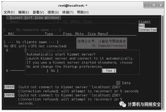 (4)该界面提示是否要自动启动Kismet服务。这里单击Yes按钮,将显示如图12所示的界面。