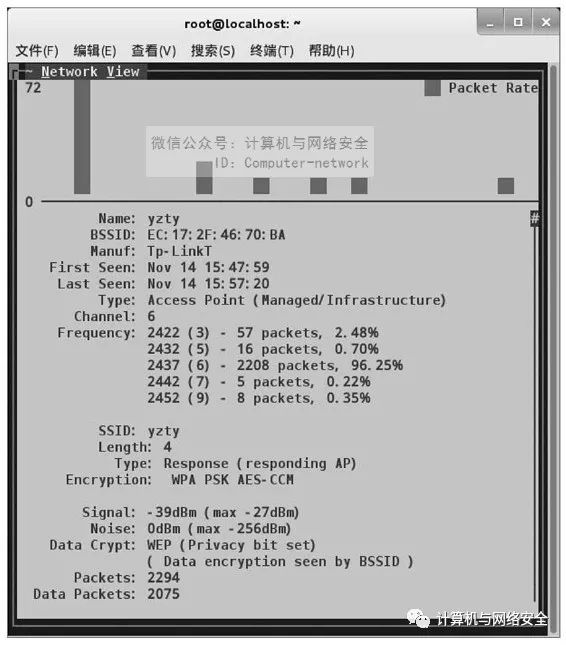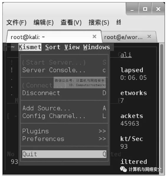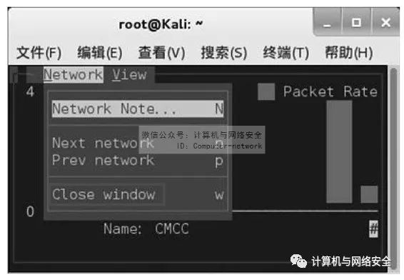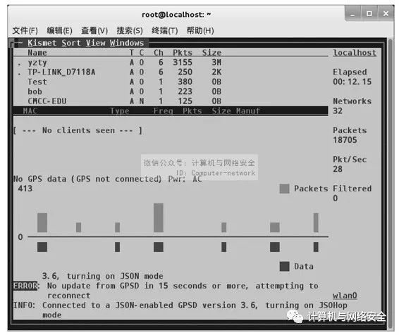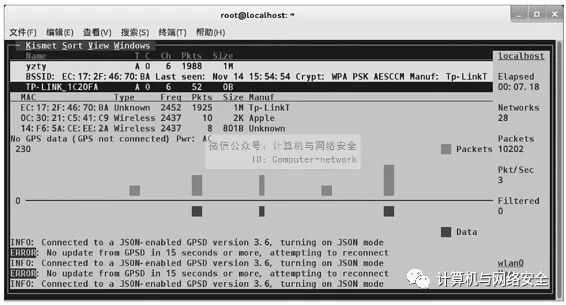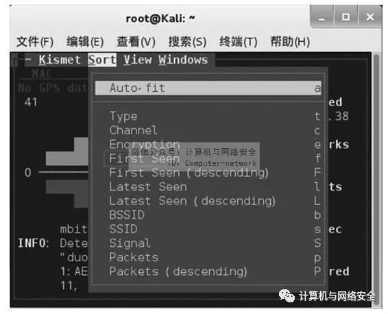 Kismet是一个图形界面的无线网络扫描工具。该工具通过测量周围的无线信号,可以扫描到附近所有可用的AP及所使用的信道等。Kismet工具不仅可以对网络进行扫描,还可以捕获网络中的数据包到一个文件中。这样,可以方便用户对数据包进行分析使用。