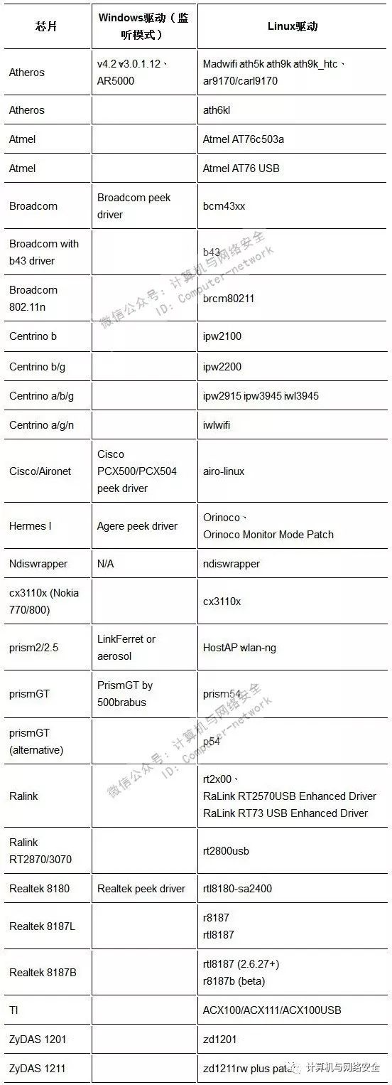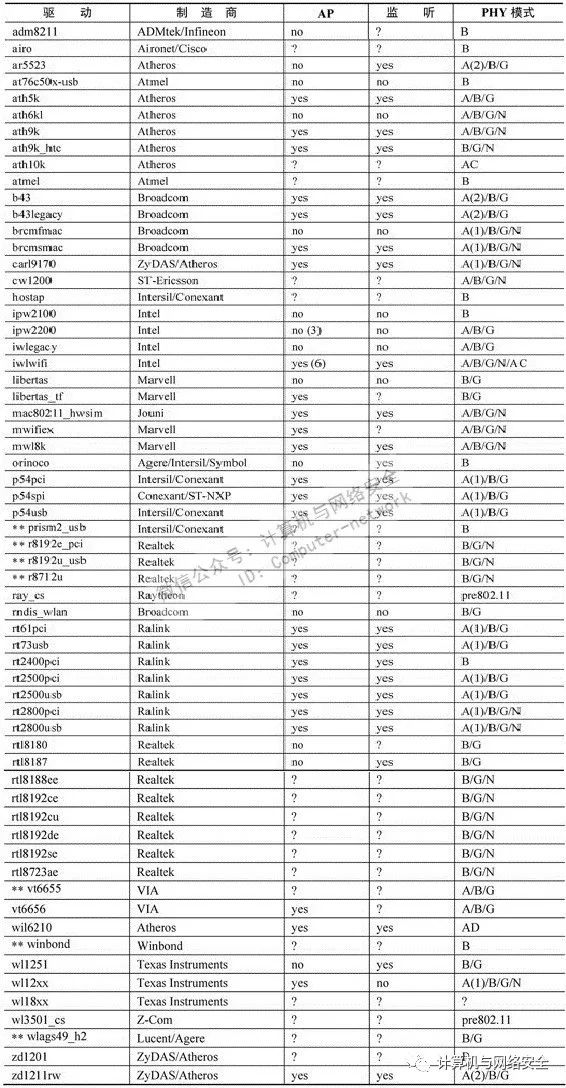 在以上表格中,列出了支持网卡的驱动、制造商、是否作为AP、是否支持监听,以及支持的协议模式。在表格中,?表示不确定,yes表示支持,no表示不支持。