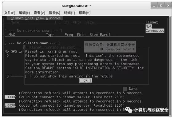 (3)该界面提示正在使用root用户运行Kismet工具,并且该界面显示的字体颜色不是灰色,而是白色的。此时,单击OK按钮,将显示如图11所示的界面。