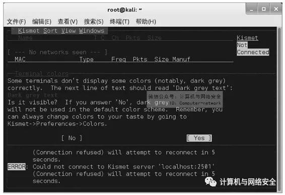 (2)该界面用来设置是否是用终端默认的颜色。因为Kismet默认颜色是灰色,可能一些终端不能显示。这里不使用默认的颜色,所以单击No按钮,将显示如图10所示的界面。