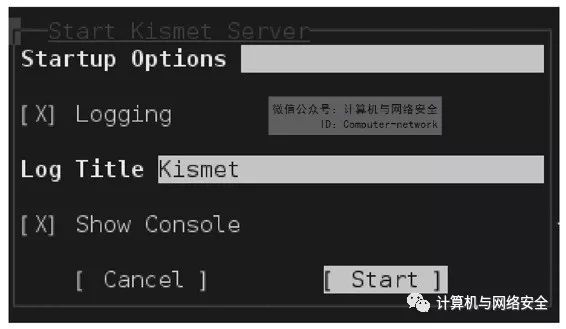 (5)该界面显示设置Kismet服务的一些信息。这里使用默认设置,并单击Start按钮,将显示如图13所示的界面。
