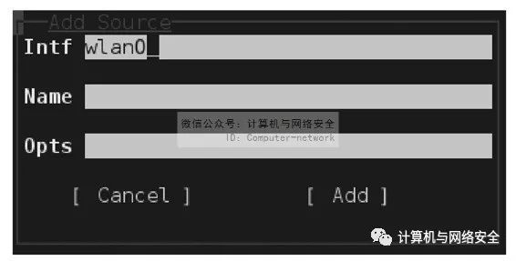 (7)在该界面指定无线网卡接口和描述信息。在Intf中,输入无线网卡接口。如果无线网卡已处于监听模式,可以输入wlan0或mon0。其他配置信息可以不设置。然后单击Add按钮,将显示如图15所示的界面。