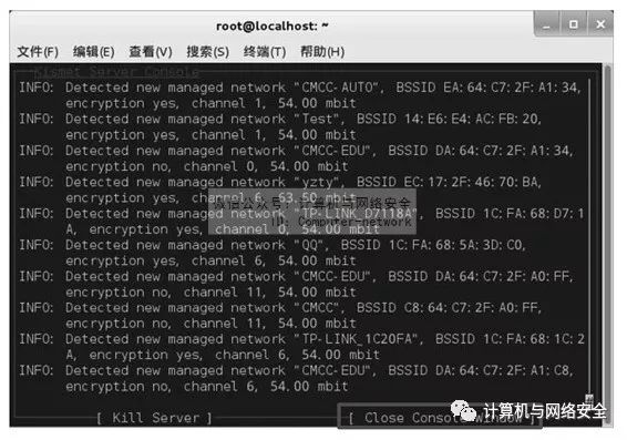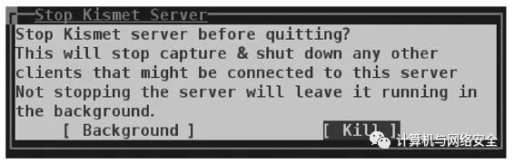 (15)在该界面单击Kill按钮,将停止Kismet服务并退出终端模式。此时,终端将会显示一些日志信息。如下所示。