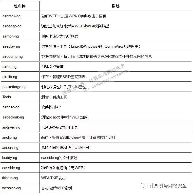 Aircrack-ng是一个套件,在该套件中包括很多个小工具,如表2所示。