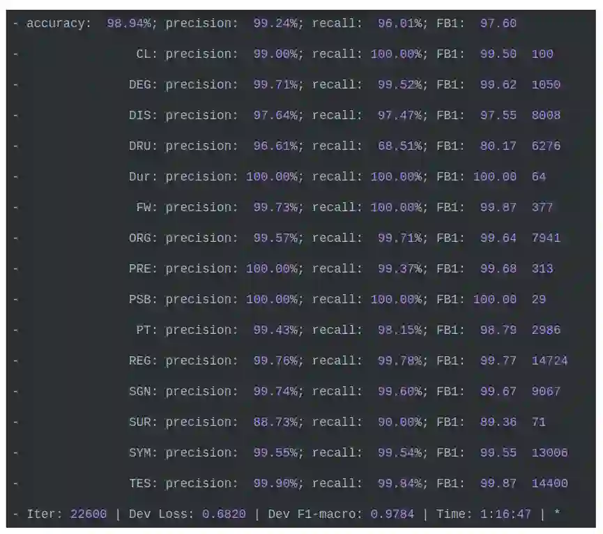 但是作者没使用预训练的字向量,没加入分词特征,没有对Loss做MASK,模型评估使用的是token级别的方法。
