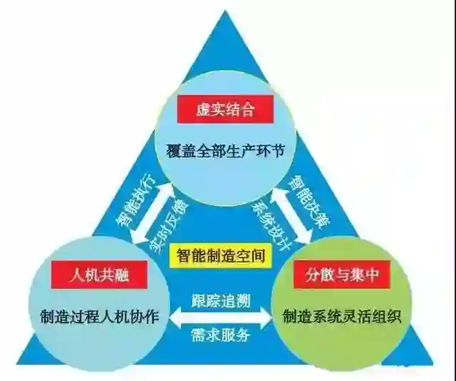 分散与集中共存、虚实结合和人机共融将成为未来智能制造空间的主要特征,其结合关系如下图所示,这种关系的形成是制造业需求牵引和信息技术驱动下的必然结果,关系的不断发展也必将形成的一种新的制造模式和制造环境。在这种环境中,不仅将泛在信息技术条件下的信息技术同工业技术进行深度融合,而且利用信息技术创新发展新的工业技术。