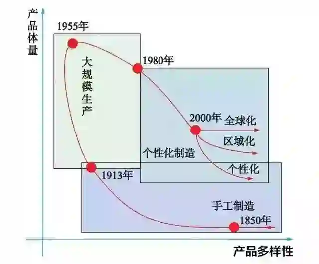 历史上,从手工制造到大规模生产的发展实现了大众化产品的转变,而目前大规模生产正在向市场和客户驱动的个性化定制方向进行转变,并且将基于更高生产效率、更高的技术层次实现用户的个性化需求。
