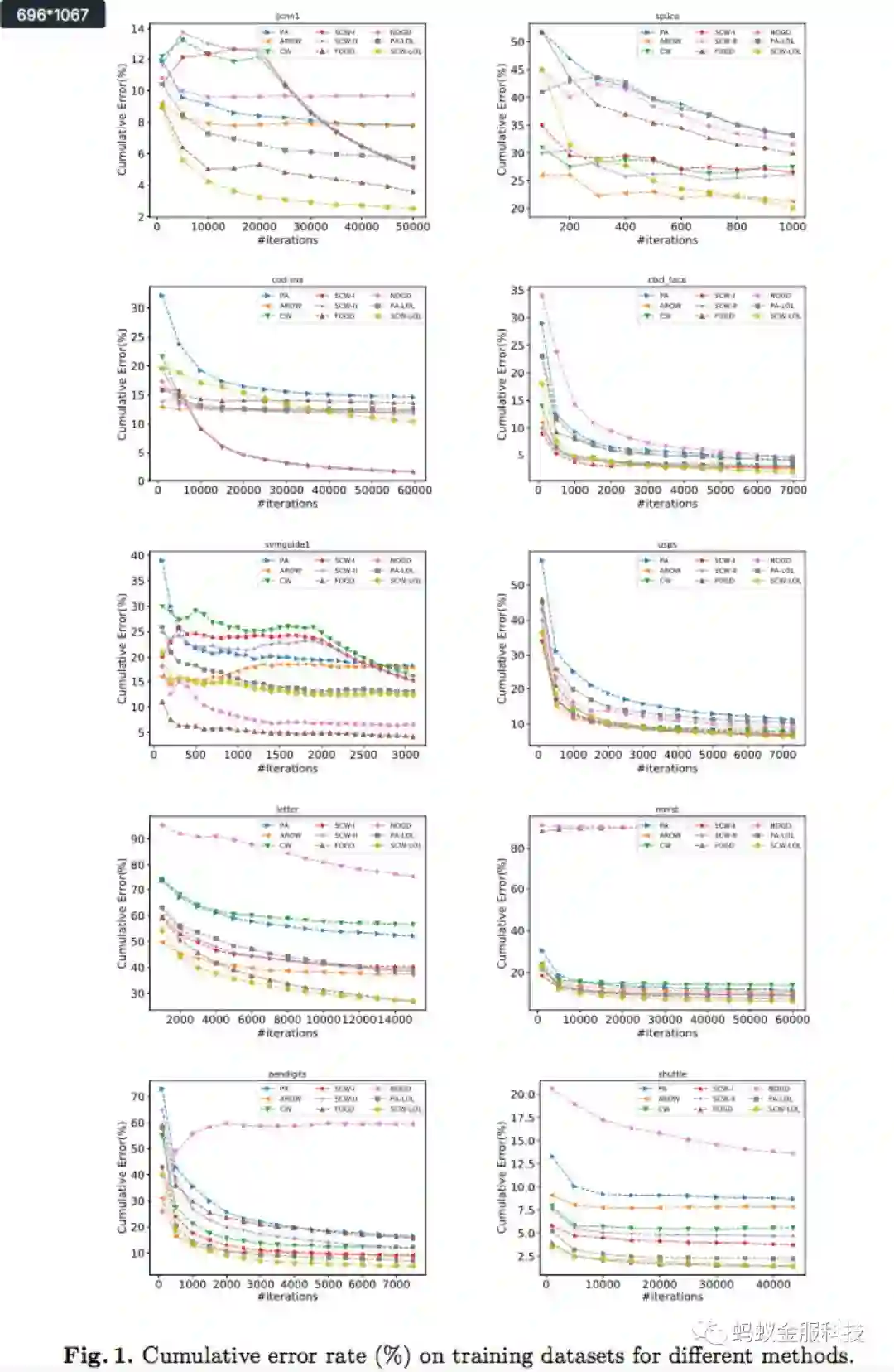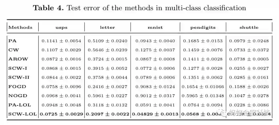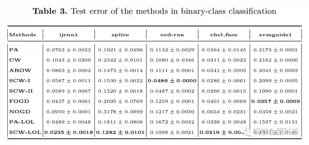 我们在10个不同数据集(5个2分类数据集,5个多分类数据集)上测试了我们的SCW-LOL算法,并同时与其他主要的在线学习算法比较,其结果如下:
