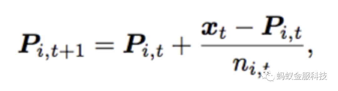 与其他传统的在线学习不同,在样本与子分类器的选择上,我们采用一种onlineKMeans算法,将样本分配到离样本距离最近的子分类器。每个子分类器维护自己的一个质心,通过质心来计算与样本的距离。同时,当样本分配到该子分类器时,更新质心如下公式: