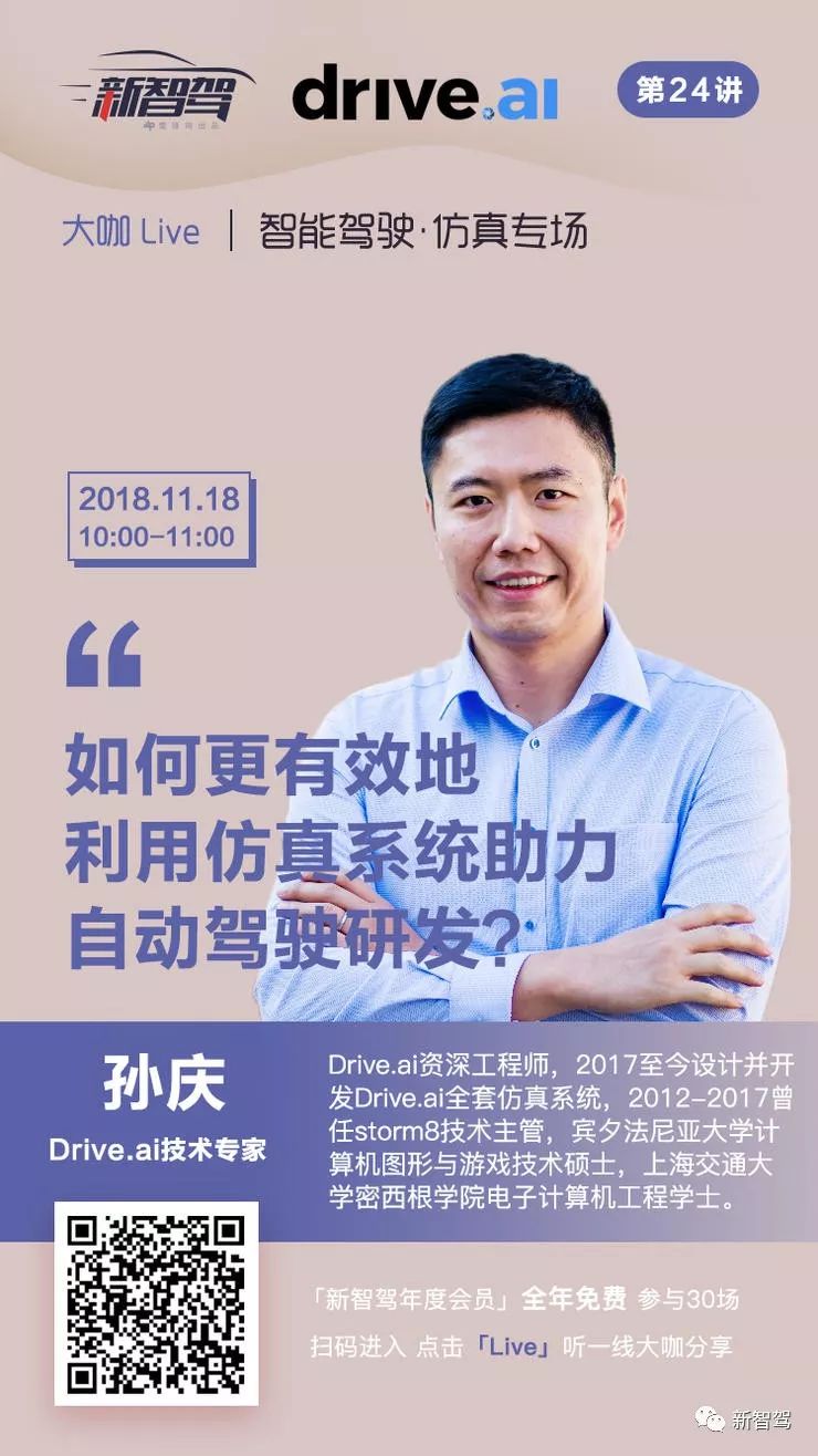 11 月 18 日(周日)上午 10 点,【大咖Live】第 24 期智能驾驶·仿真专场,我们邀请到 Drive.ai 技术专家孙庆详细解析“如何更有效地利用仿真系统助力自动驾驶研发?”。照例,本次分享对新智驾年度会员免费开放。