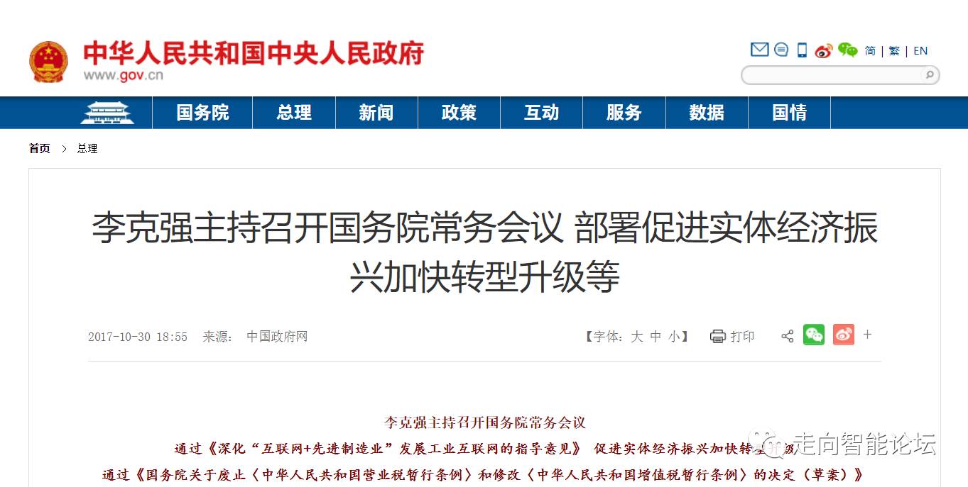 日前,李克强总理主持召开国务院常务会议,通过《深化“互联网+先进制造业”发展工业互联网的指导意见》,促进实体经济振兴、加快转型升级。本文来自:中国政府网,由《走向智能论坛》微信公众号推荐阅读。