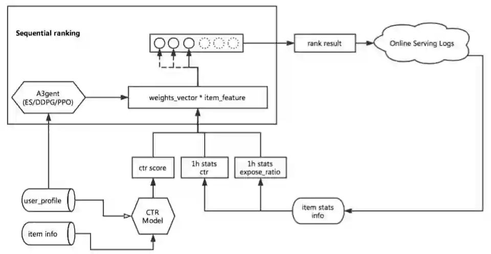 近期我们正在和计算平台的团队合作,基于deep-ctr的base模型(特征空间较大,但是训练时间较长更新较慢),结合drl做reranking(根据ctr-score以及实时线上的一些反馈数据,通过构建sequential的排序方式进行episode建模),强化点击率/解决率/满意率等目标。