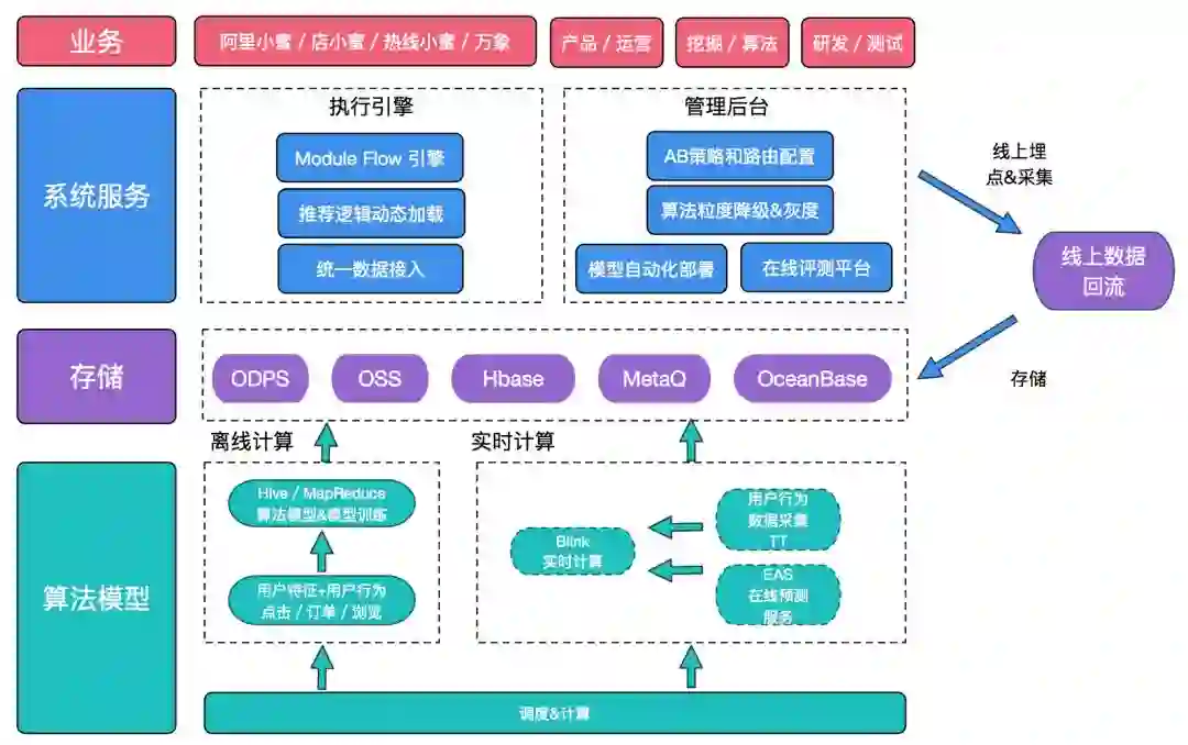 3.实时计算部分,数据源主要来自于用户线上的实时日志数据,通过Blink和EAS服务进行实时计算,输出预测结果,一部分直接推送给终端用户,另一部分和用户进线后的预测结果进行整合。
