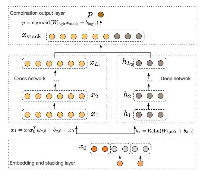 图片来源《Deep & Cross Network for Ad Click Predictions》Ruoxi Wang,2017。交叉网络结构形式中,每一层都是学习一个特征交叉映射f:ℝd→ℝd ,来拟合xl+1−xl 的残差。一方面,每一层学习的映射f 都是一个对交叉特征的非线性映射,然后通过拟合残差的方式,提高权重的敏感度,更适合稀疏的输入,同时另一方面,方便网络整体的反向传播,提高网络训练效率。右侧是一般的全连接层,是对原始输入特征的非线性映射,最后连接层是softmax。