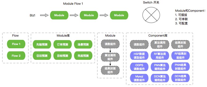 Flow:工作流,一组实现完整预测功能的Module和Switch的DAG组合。一个Module可以被多个flow共享(一次请求只执行一次)。