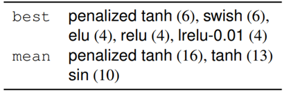 表 5:获得前三名的次数统计。括号中是进入前三的次数,仅给出了至少 4 次进入前三的激活函数。