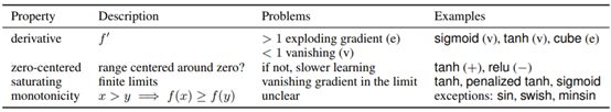 人们推测激活函数的很多属性都对学习成功至关重要。表 2 列出了其中一些,另外还给出了一些简要的说明和解释。