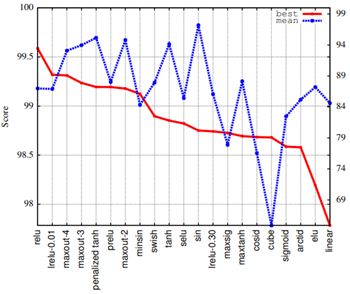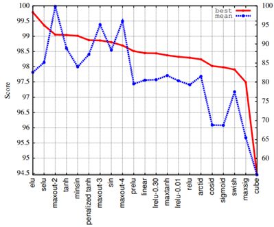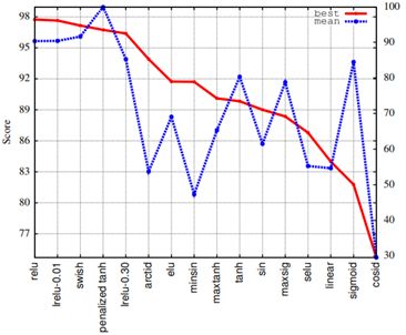 实际上,他们最成功的函数——他们称之为 swish,并不满足这两个条件。但是,和之前的工作一样,他们也只是在少数不同数据集和少数几类不同网络上对比评估了他们的新发现和(整流)基准激活函数——这些数据集通常取自 CIFAR(Krizhevsky, 2009)和 ImageNet(Russakovsky et al., 2015)等图像分类社区,使用的网络也通常是充斥着图像分类社区的深度卷积网络(Szegedy et al., 2016)。