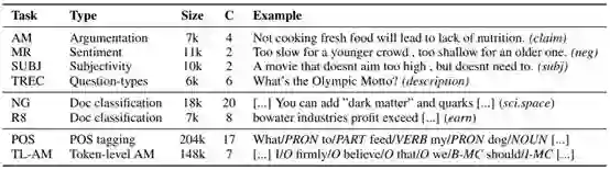 表 3:我们实验中使用的评估任务,按任务类型(句子分类、文档分类、序列标注)分组,并给出了统计数据和示例。C 是指所要预测的类别的数量。