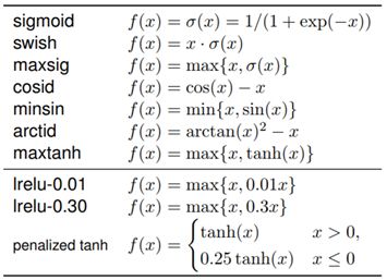 表 1:上:sigmoid 函数与 Ramachandran et al. (2017) 中表现最好的 6 种激活函数。下:具有不同参数的 LReLU 函数以及 penalized tanh。