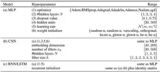表 4:每种网络类型的超参数范围。超参数取自指定范围中的离散或连续均匀分布。重复的值表示多个集合。N (µ, s) 是均值为 μ 且标准差为 s 的正态分布;µ = m 是 Keras 的特定优化器的默认值(如果选取的学习率小于 0,则我们选择它为 m)。
