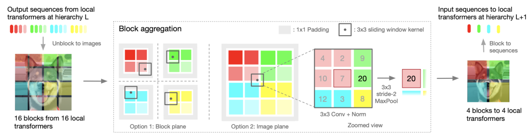 本文对这种层次化的设计进行了分析和改进,作者认为在Transformer模型中通过在非重叠图像块上提取特征,并以分层次的形式将其进行聚合是这种层次化设计的精髓,其中对多个块特征融合的函数(block aggregation function)可以促进跨区域非局部信息的交互。基于这一理念,本文提出了一种层次化嵌套Transformer(NesT),其仅需要在原始ViT代码上修改几行就可以实现。