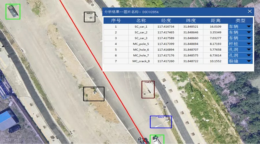 图像分析的异常目标检测,充分的利用了航拍图像中的颜色纹理和形状的特征,将在管线走向两旁指定范围内关注目标,如工程车辆、房屋、裂缝、管线漏油、管线裸露等,通过深度学习算法自动识别和标注,判定异常目标的种类,并提供定位,显示经纬度,检测完毕后可自动生成分析报告,反馈至用户邮箱。
