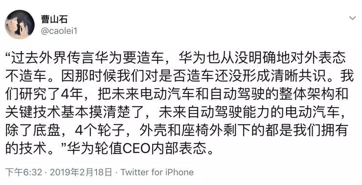 “过去外界传言华为要造车,华为也从没明确地对外表态不造车。因那时候我们对是否造车还没形成清晰共识。我们研究了4年,把未来电动汽车和自动驾驶的整体架构和关键技术基本摸清楚了,未来自动驾驶能力的电动汽车,除了底盘,4个轮子,外壳和座椅外剩下的都是我们拥有的技术。”近日华为轮值CEO内部表态。