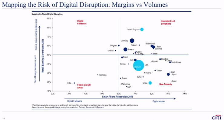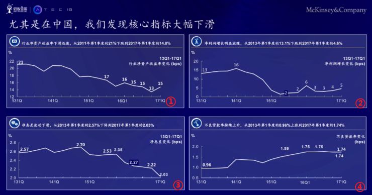银行业并不是非常以消费者为中心。该图右下角有中国,可以看到数字化、智能手机的数据化;在右上的象限,会看到利润压缩,银行总体来说收入可能会降低;但在左下角,压力主要是来自外部,比如你的客户关系受到损失。