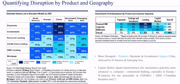 我们试着量化新旧商业模式下业务量的变化,业务模式颠覆较多的会是在中国、北美,而欧洲、香港、新加坡这些相对来说影响比较小。然后影响比较大的是支付、投资,另外还有一些中小企业贷款还有消费贷款,他们受到的影响程度各不相同。