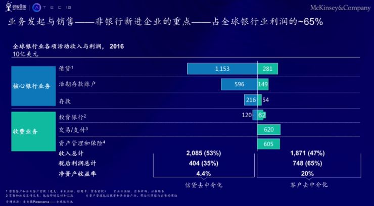 比如左边显示的,这些银行的收益通常是来自于向客户提供存贷款。但是右边的业务分布里可以提供十几种服务,基本上实现了盈利的60%和20%的净资产收益率;而左边的净资产收益率只有4.4,这是一个非常差的业绩表现——可以看到,新增利润的情况都是来自新兴的收费业务。这是银行业所遭遇的常见瓶颈情况,数据也说明客户其实正在流失到其它的部门。