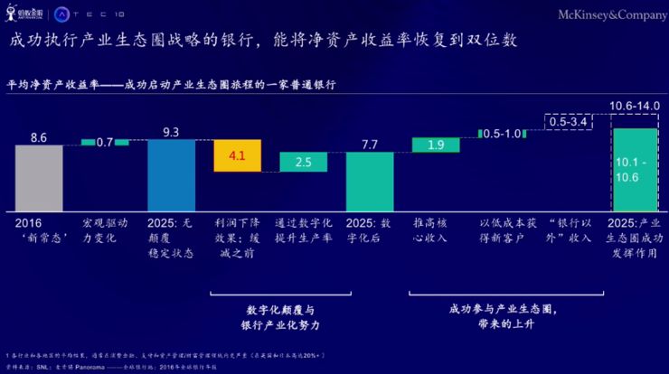 从图表可以看出,如果银行能够成功打造出一个产业生态圈,就有望通过这个数字化进程提高其核心业务收入,同时获客成本降低,通过跨圈或跨行销售来得到新的客户,从而能够产生银行业务以外的其它业务收入,最终让资产收益率重回到高位态势。