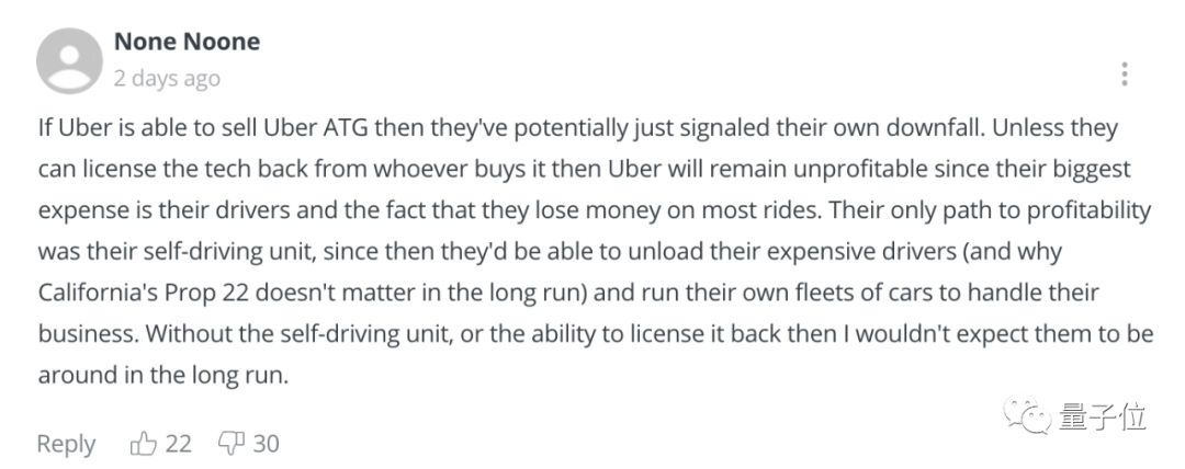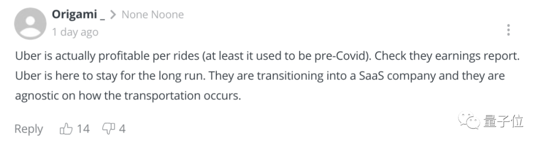 也有网友表示,看财报的话,Uber每趟车其实是盈利的,至少在新冠之前是这样的。但Uber转型成为SaaS公司,他们不知道自动驾驶将如何发展。
