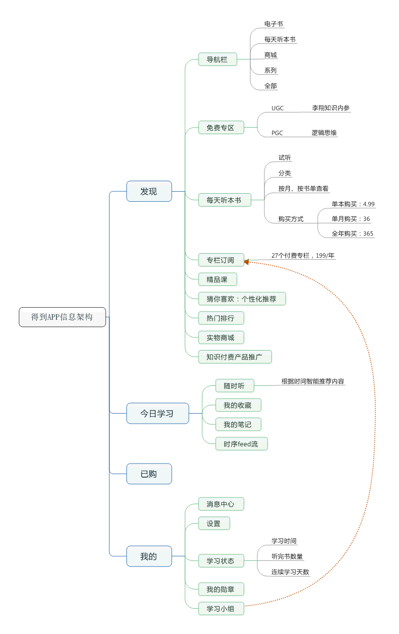 通过得到APP的信息架构来看,这款产品的功能设置比较简洁,内部结构并不复杂,对于希望学习的用户来说有一个较好的用户体验。首页即发现页罗列了目前得到app的所有知识产品供用户选择和体验。