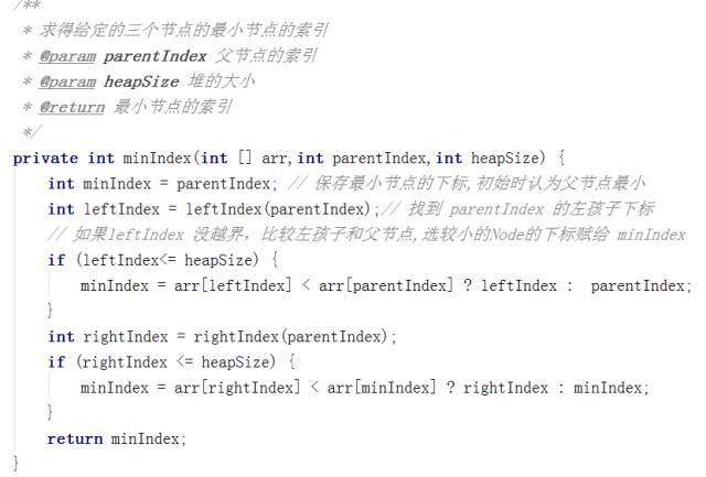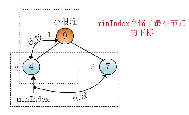 我用一个变量存储值最小节点的下标,先让左孩子和父节点比,将其中值小的节点的下标存入minIndex,然后让右孩子与刚才选出最小值的节点比,更新minIndex