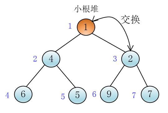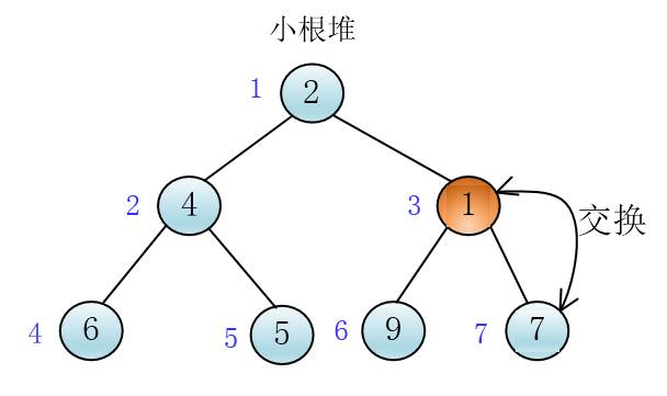 很容易可以想到,可以将1和它的父比较,如果小于其父,那就交换两个节点的值