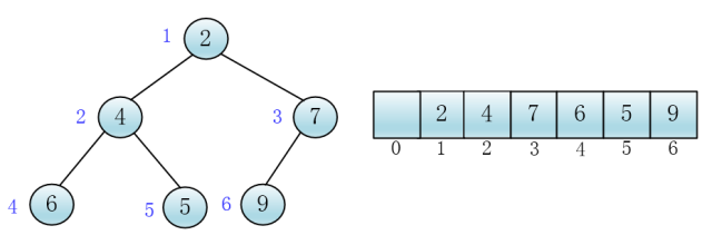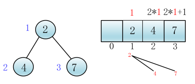 这样,父子关系就可以用下标来表示了,显然,在k下标处的节点的左孩子一定在2*k小标处,右孩子在2*k+1处