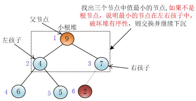 我找出以要下沉节点为父节点和它的左右孩中值最小的节点,如果该节点是左右孩子其中一个,则下沉,否则不下沉