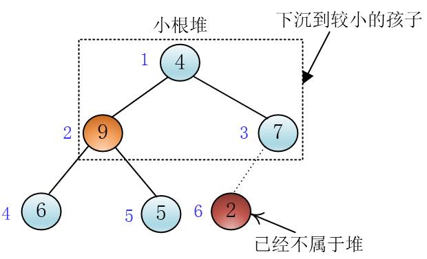与插入相对应,我可以将堆顶这个元素向下沉