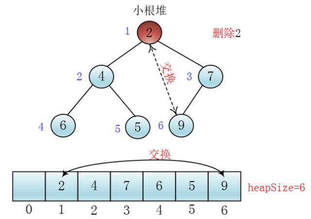 这样我就通过交换堆顶元素与最后一个元素和heapSize减一把堆顶元素删除了