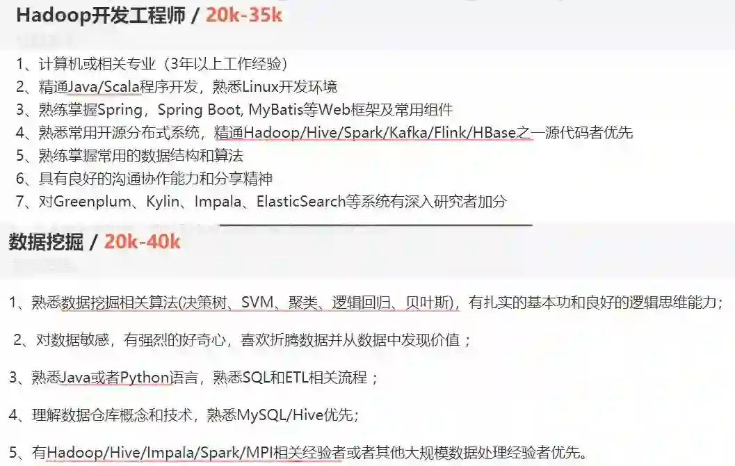 目前,普通的Hadoop大数据工程师起薪也在20K/月,稍有经验薪资还要多几千,数据挖掘、机器学习、人工智能相关人才薪资更高。