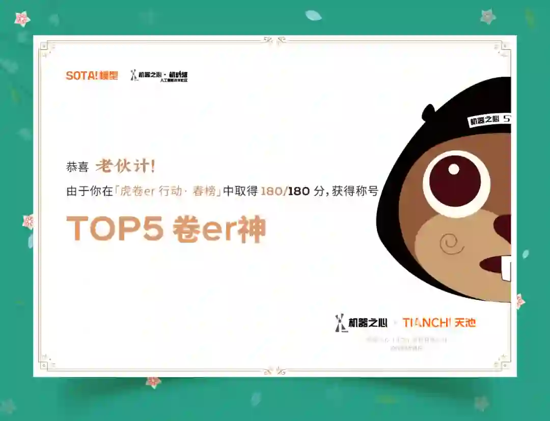 在「虎卷er行动 · 春卷er」中积分达到 60 分以上的老伙计将获得机器之心「SOTA !模型」、「机动组」及共同准备的「虎卷er行动· 春卷 er」心意盲盒 ~