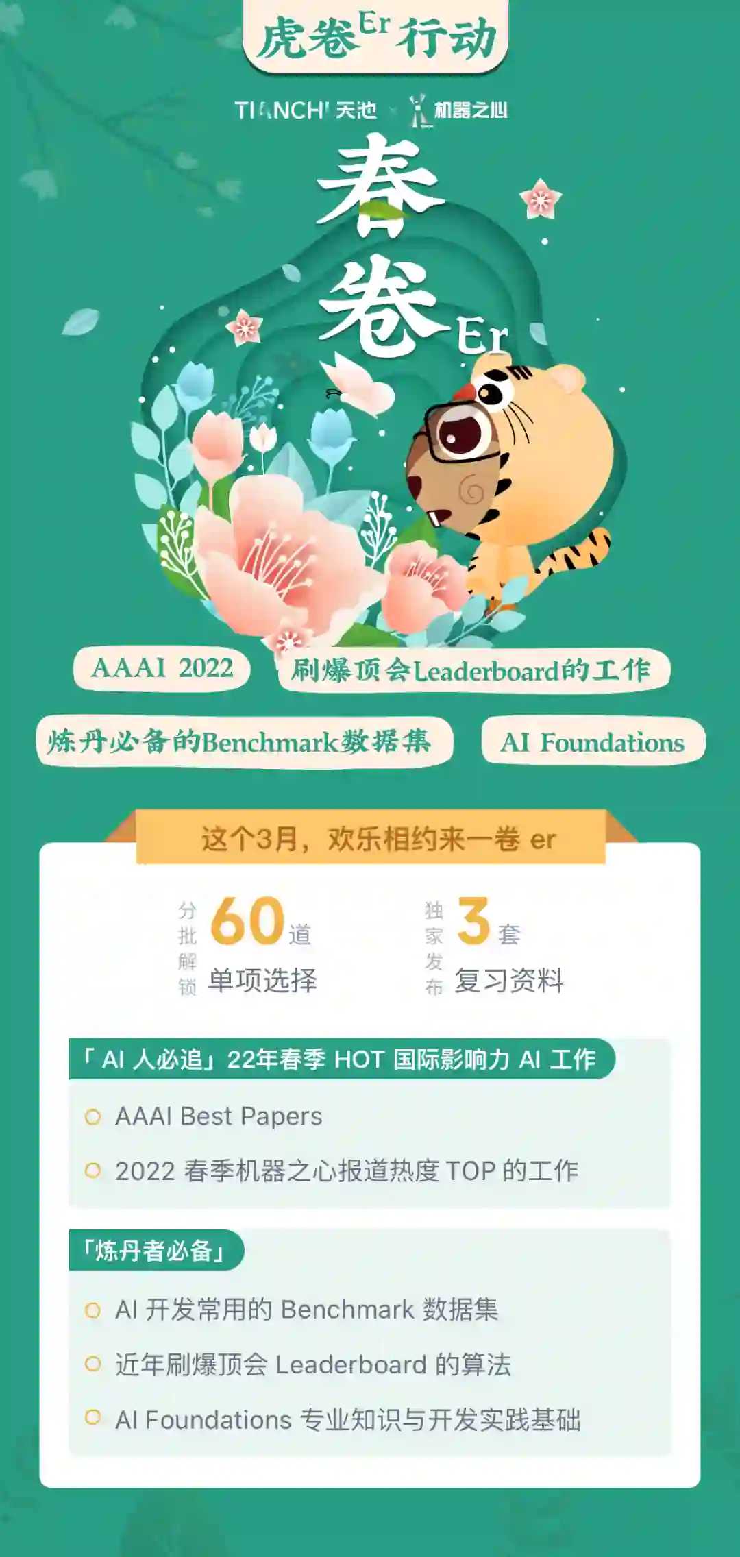 基于「 AI人必追」的本季度举办的国际顶会及机器之心报道中的热门新工作,「炼丹者必备」的基准数据集、AI顶会挑战赛优胜算法及开发基础知识,机器之心与天池团队共同设计了由60道选择题构成的「虎卷er · 春榜试题」,并编撰了 3 套独家配套技术复习资料,帮助关注前沿AI技术发展的开发者梳理第一季度的重要 AI 技术工作的同时帮助注重实践技能的开发者快速温故知新,巩固知识与技能。
