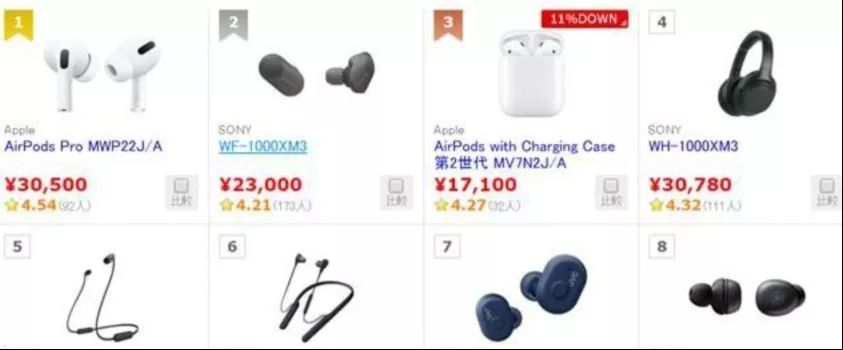 另据日本电子商务商品信息网站 KAKAKU 对本土市场的统计,霸榜耳机类别最高销量前八名的产品全是无线耳机。