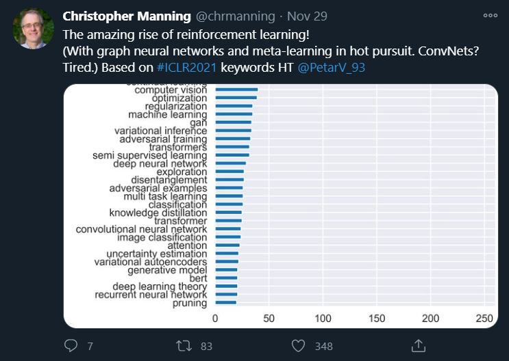 看完统计结果以后,斯坦福大学教授 Christopher Manning 表示:「强化学习惊人地崛起了!但卷积神经网络已现疲态。」