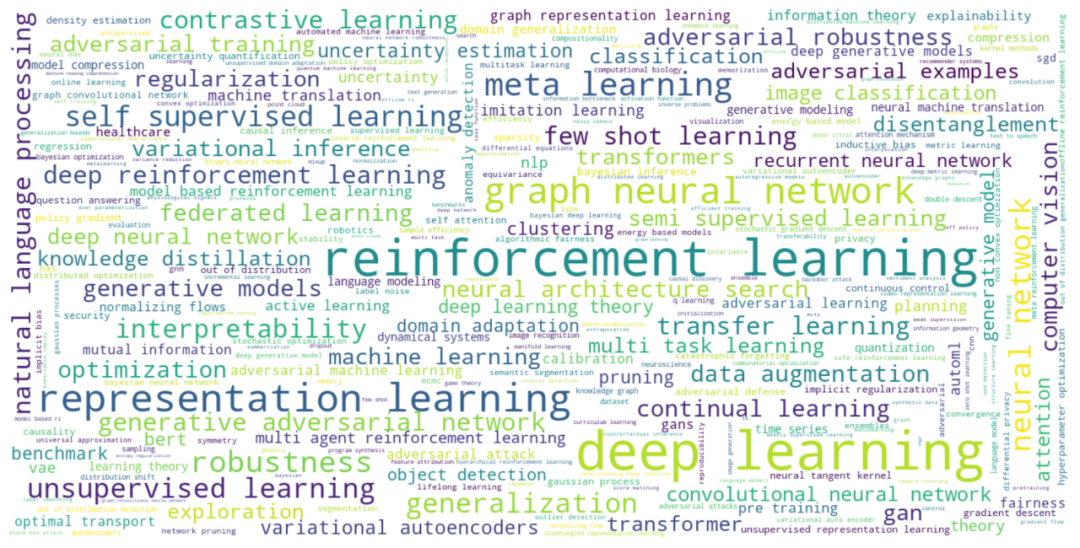 下图列举了提交论文中出现频率排名前 50 的关键词,与往年一样,深度学习、强化学习、表征学习、图神经网络都是非常热门的话题。但与去年的统计数据相比,卷积神经网络(convolutional neural network)的热度骤降,「元学习」、「表征学习」、「图神经网络」的热度均有上升。
