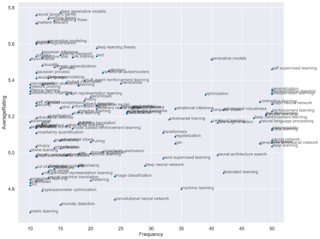 项目作者还对论文平均得分和关键词频率进行了统计。结果显示,如果论文作者希望尽可能地获得高评分,或许 ta 应该使用「深度生成模型」(deep generative models)、「归一化流」(normalizing flows)、「神经正切核」(neural tangent kernel)、「梯度下降法」(gradient descent)等关键词。