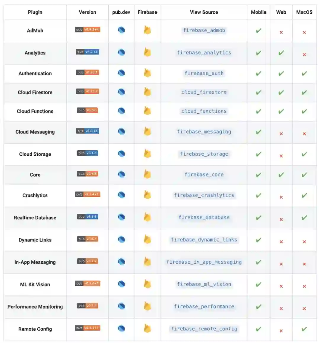 尽管每个 Firebase 插件都支持 Android 和 iOS,但并非所有插件都支持 macOS。随着清单中后续工作的开展,我们将逐步提供支持。一些 Flutter 插件也已经同时支持移动端和 web 端。随着工作的继续,支持范围将不断扩大。